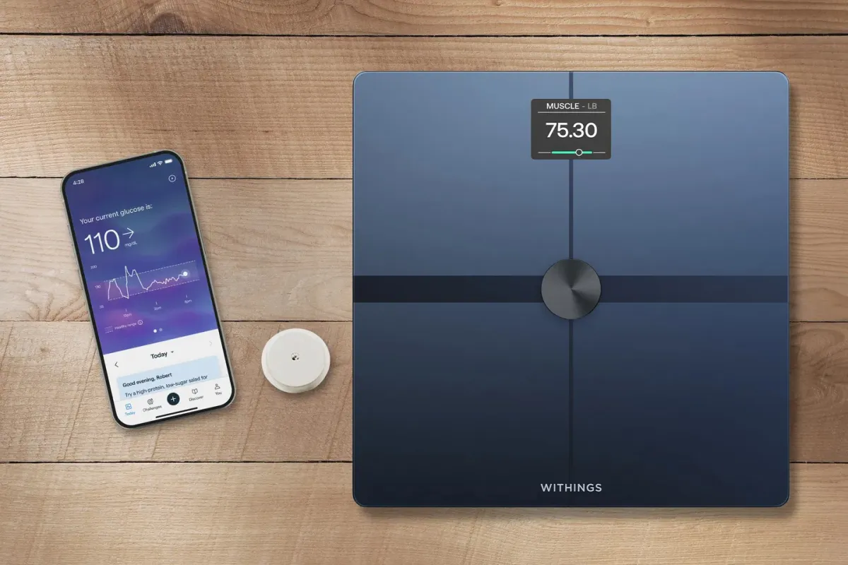 Better yet, the Withings scale gives you an even more complete picture. The scale displays your current body fat percentage, standing heart rate, muscle mass and 90 other biomarkers. Everything, including your glucose levels, shows up in the app for easy tracking.