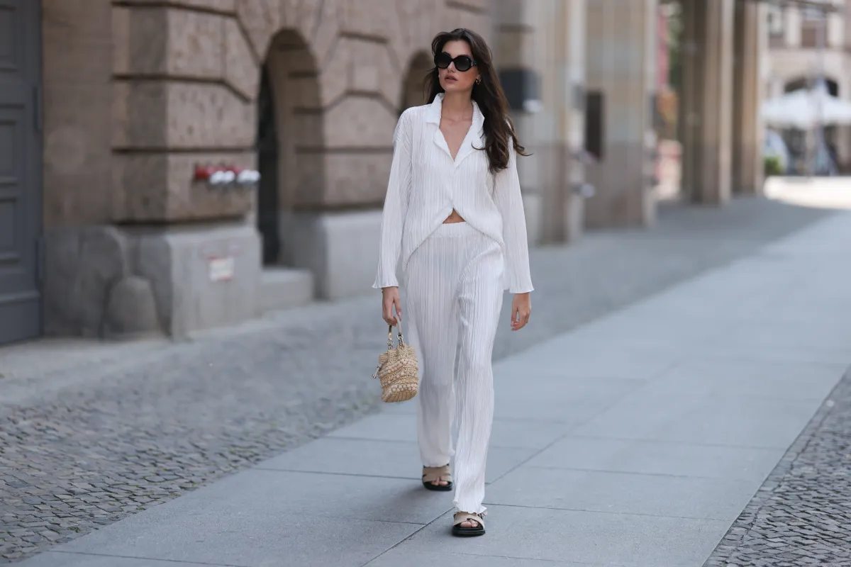 17. Mediterranean Vacation: A solid tee tucked into printed pants gives this vacation-ready set serious Santorini vibes, so don’t be surprised if people assume you traveled.