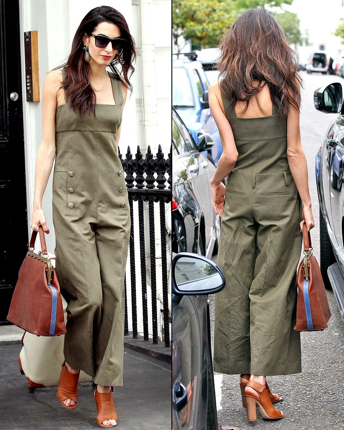 The accomplished human rights lawyer, 37, who’s married to George Clooney, toted her own luggage through the streets of England’s capital while clad in an olive-green, linen one-piece, accented with gold buttons, by Sonia Rykiel (which retails for $1,070). She accessorized the outfit with a leather top-handle purse, peep-toe shoes, and, most glamorously, giant, pear-shaped statement danglers.