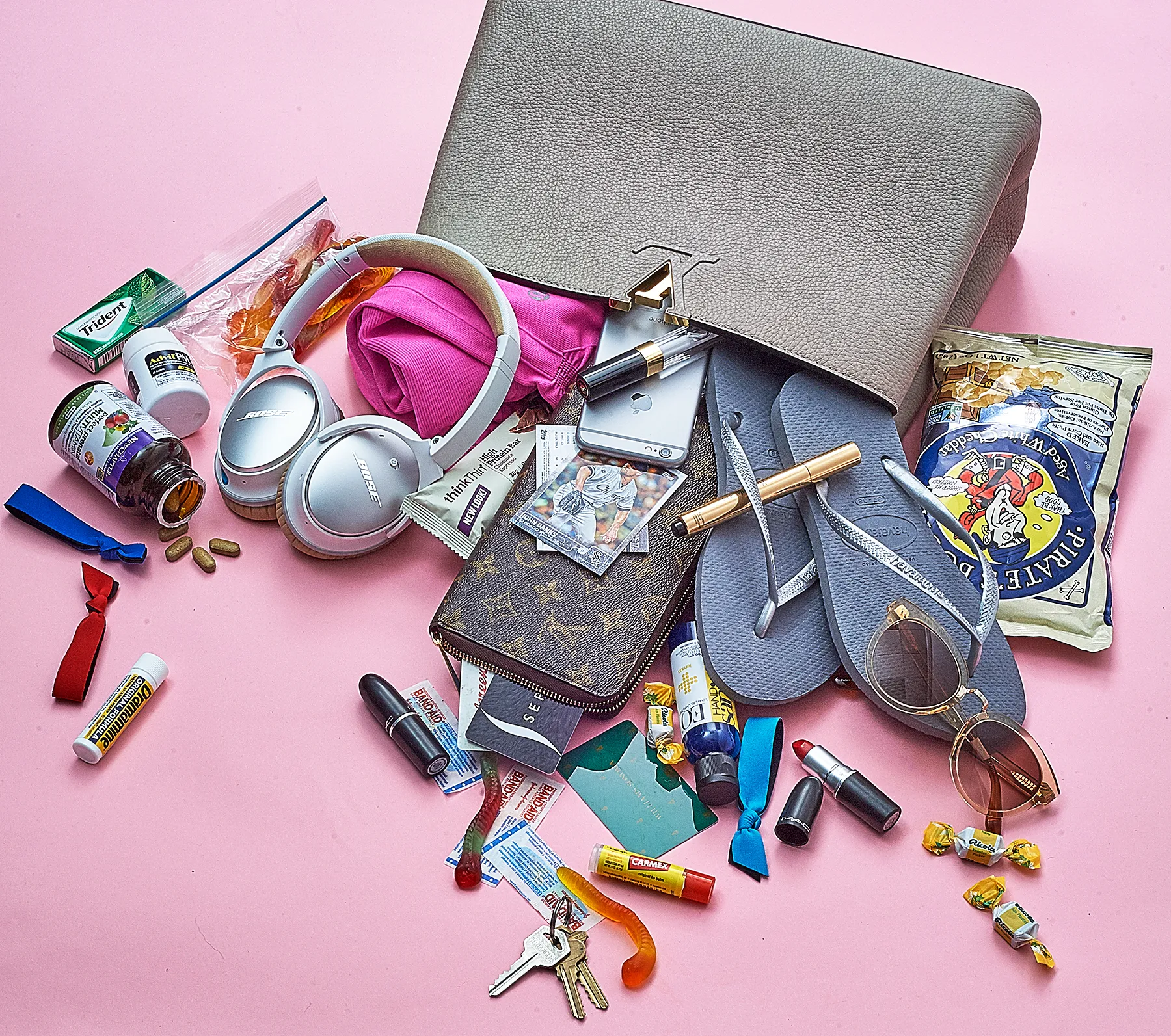 More of what’s in Monroe’s bag: Sephora card, Beyond Yoga black sports bra, Havaianas black flip-flops, tan TOMS sunglasses, Nasty Gal sunglasses, black iPhone 6, Bose noise-canceling headphones. phone charger, Ruby Woo Mac lipstick, YSL concealer, Emy Jay’s hair ties, Aveeno makeup wipes, Carmex, gummy worms, Luxury Handbag Shopping, Brookstone fuzzy blanket, Band-Aids, Advil, Advil PM, Dramamine, Ricola, and Afrin nose spray.