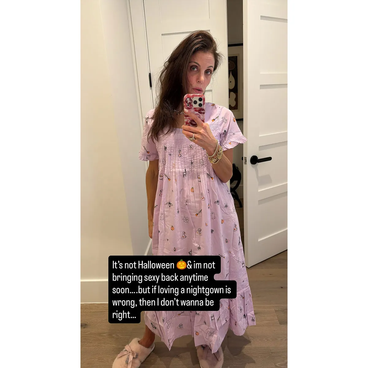 Frankel, 55, showed off her sleepwear while snapping a mirror selfie. In the pic, which she shared via Instagram on Tuesday, January 13, the Real Housewives of New York City alum wore a light pink, ankle-length nightgown featuring a scoop neck, short sleeves and a flowy, pleated skirt. The design was finished with delicate prints of pumpkins, brooms, witch hats and more.