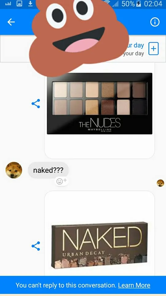 Undeterred, the guy kept pushing, writing: “lol I meant like nudes.” “Oh! Of course,” Nicole responded, along with a snapshot of Maybelline’s The Nudes eye shadow palette. But the clueless dude still wasn’t giving up, replying, “naked???” to which she sent a pic of Urban Decay’s Naked palette. LOL!
