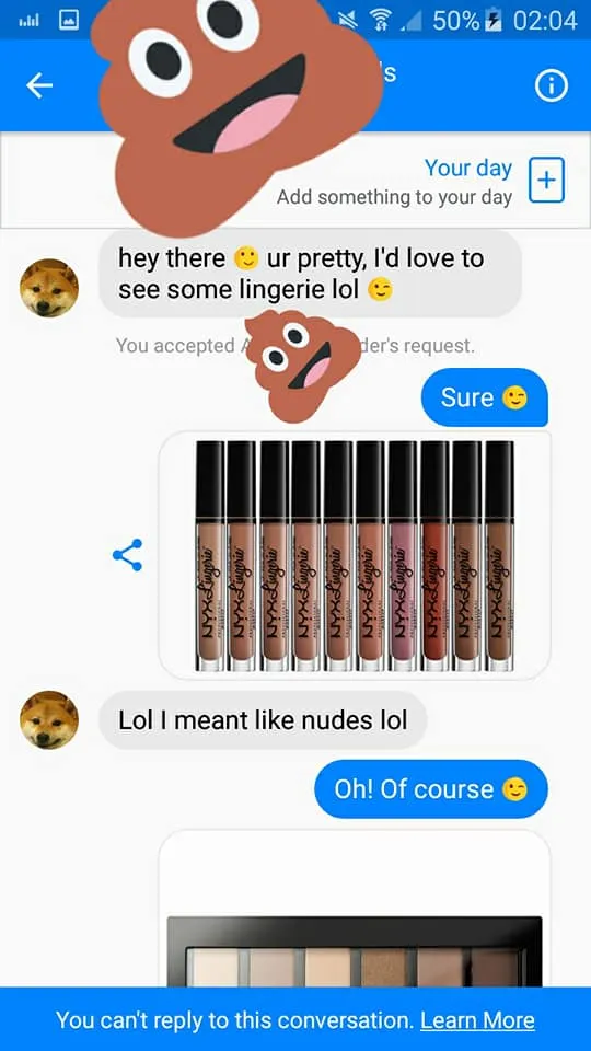 The guy (whose name she obscured with an emoji) first contacted her via Facebook Messenger, saying, “Hey there ur pretty I’d love to see some lingerie.” Nicole replied “Sure” with a wink face before sending a photo of NYX’s Lip Lingerie glosses. Genius!