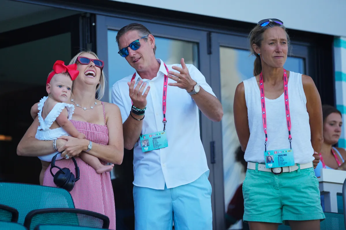 The sporty couple watched the game from a private box, where kids Sterling, 4, Bronze, 2, and Golden, 7 months, twinned in matching Current gear. Sterling and Bronze each wore white T-shirts with the team logo and a pair of dark shorts, while Golden was dressed in a branded onesie, accessorized with a giant, red hair bow.