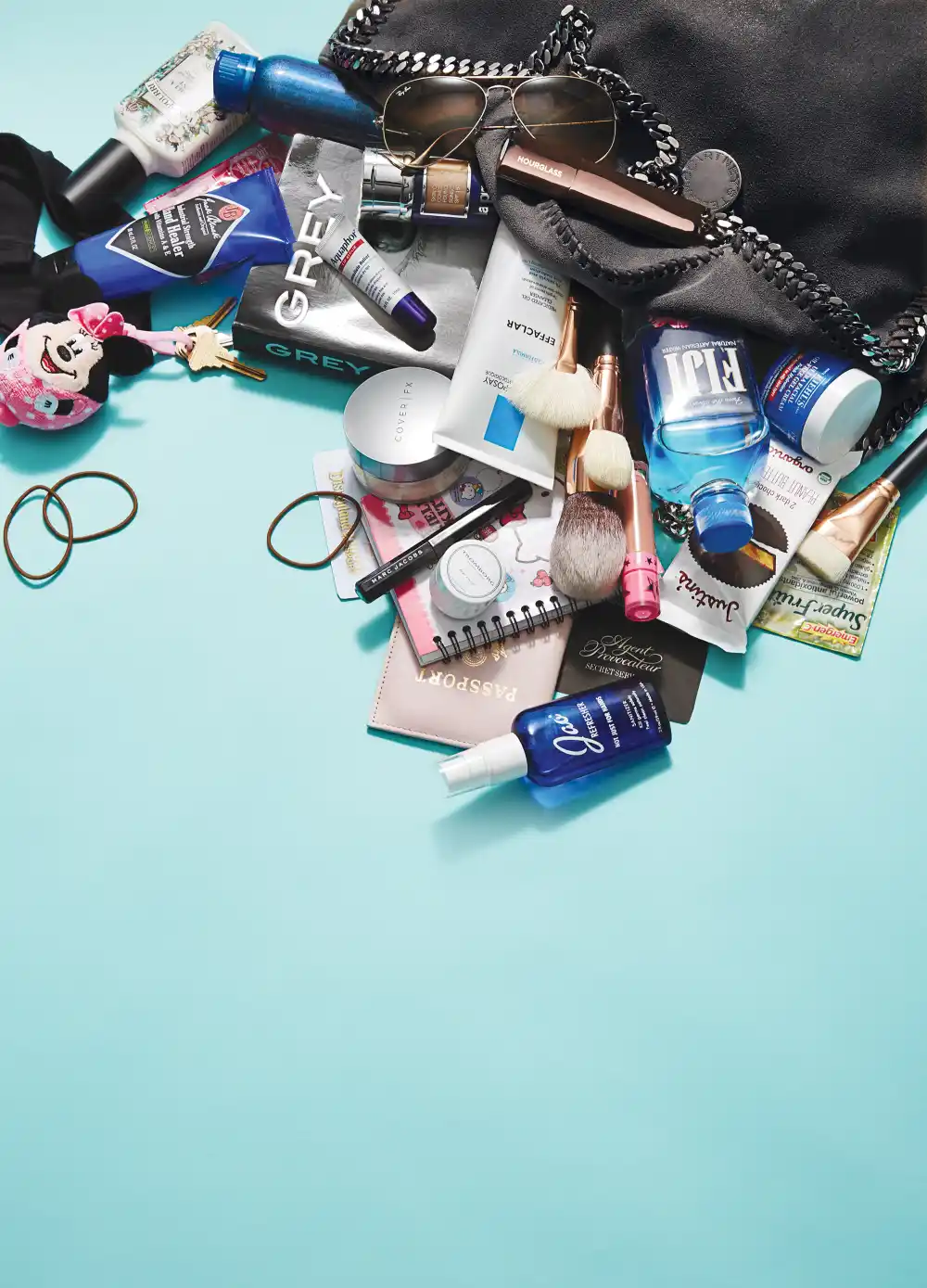 Also in Serratos’ purse: Louis Vuitton wallet, Minnie Mouse head key chain, iPhone 6, white Apple headphones, black makeup bag, Hourglass Vanish Seamless Finish Foundation stick, Cover FX Setting Powder, Morphe rose gold makeup brushes, Jeffree Star Mannequin lip stain, La Roche Posay medicated gel cleanser, Marc Jacobs mascara, Scunci headband, New Politics pullover sweater, paper, pens, Hello Kitty notebook, Jack Black Hand Healer, Emergen-C, Agent Provocateur VIP card, La Prairie Skin Caviar Foundation, Aquaphor.