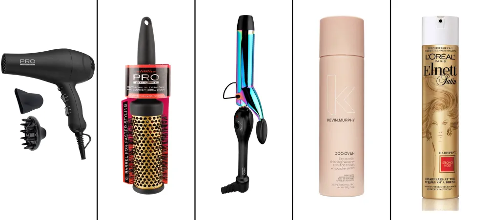 From left: PRO Beauty Tools Professional 1875W IONIC AC Motor Dryer ($40, target.com), PRO Beauty Tools XL Ionic Ceramic Thermal Brush ($13, target.com), PRO Beauty Tools 1 1 1/4-inch Professional Iridescent Curling Iron ($28, walmart.com), Kevin Murphy Doo.Over ($29, kevinmurphy.com.au), Elnett Satin Hairspray Strong Hold ($7, ulta.com)