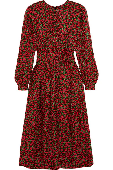 The Duchess of Cambridge, 34, cozied up in a printed red and green Vanessa Seward dress, cinched at the waist with a gold-buckled belt. She accessorized with a square clutch, suede stiletto heels and embellished gold hoop earrings.