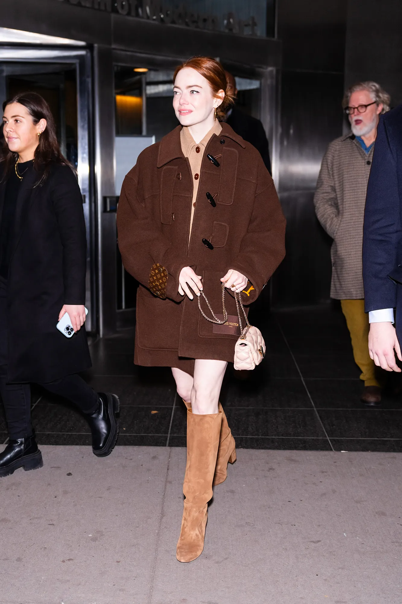 The Oscar-winning actress attended a BAFTA screening of her new movie, Poor Things, on Tuesday, December 5, in New York City. She wore a khaki Kenzo skirt and jacket combo, tossing on a brown Louis Vuitton coat while outside. Her knee-high suede boots, however, were the star for Us!
