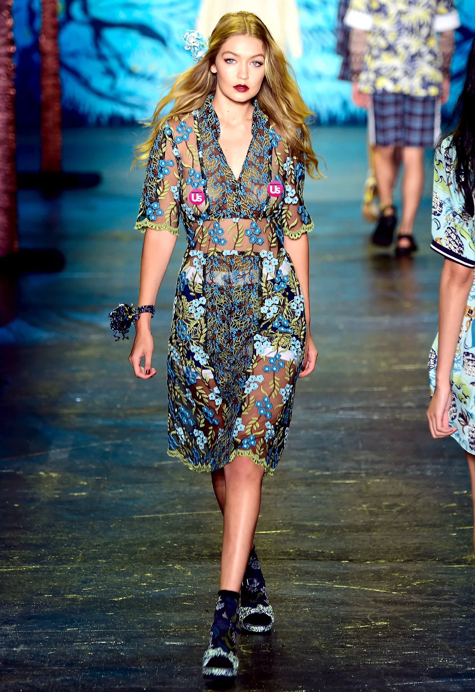The see-through, embroidered dress by the couture designer left little to the imagination as it hinted at Hadid’s nipples and showed off her trim torso. Sui styled the revealing look with white shorts, floral tube socks, and blue patterned heeled sandals.