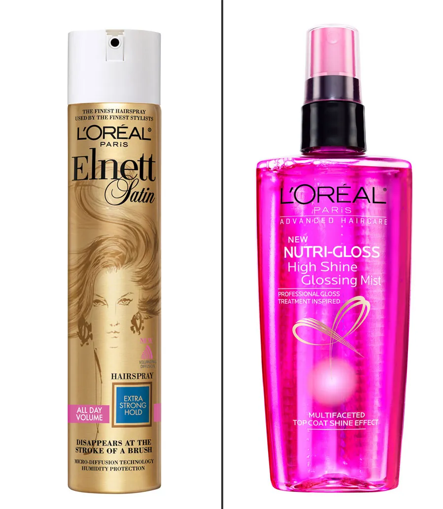L’Oréal Paris Elnett Satin Extra Strong Hold hair spray, $15, lorealparisusa.com; L’Oréal Paris Nutri-Gloss High Shine Glossing Mist, $7, lorealparisusa.com