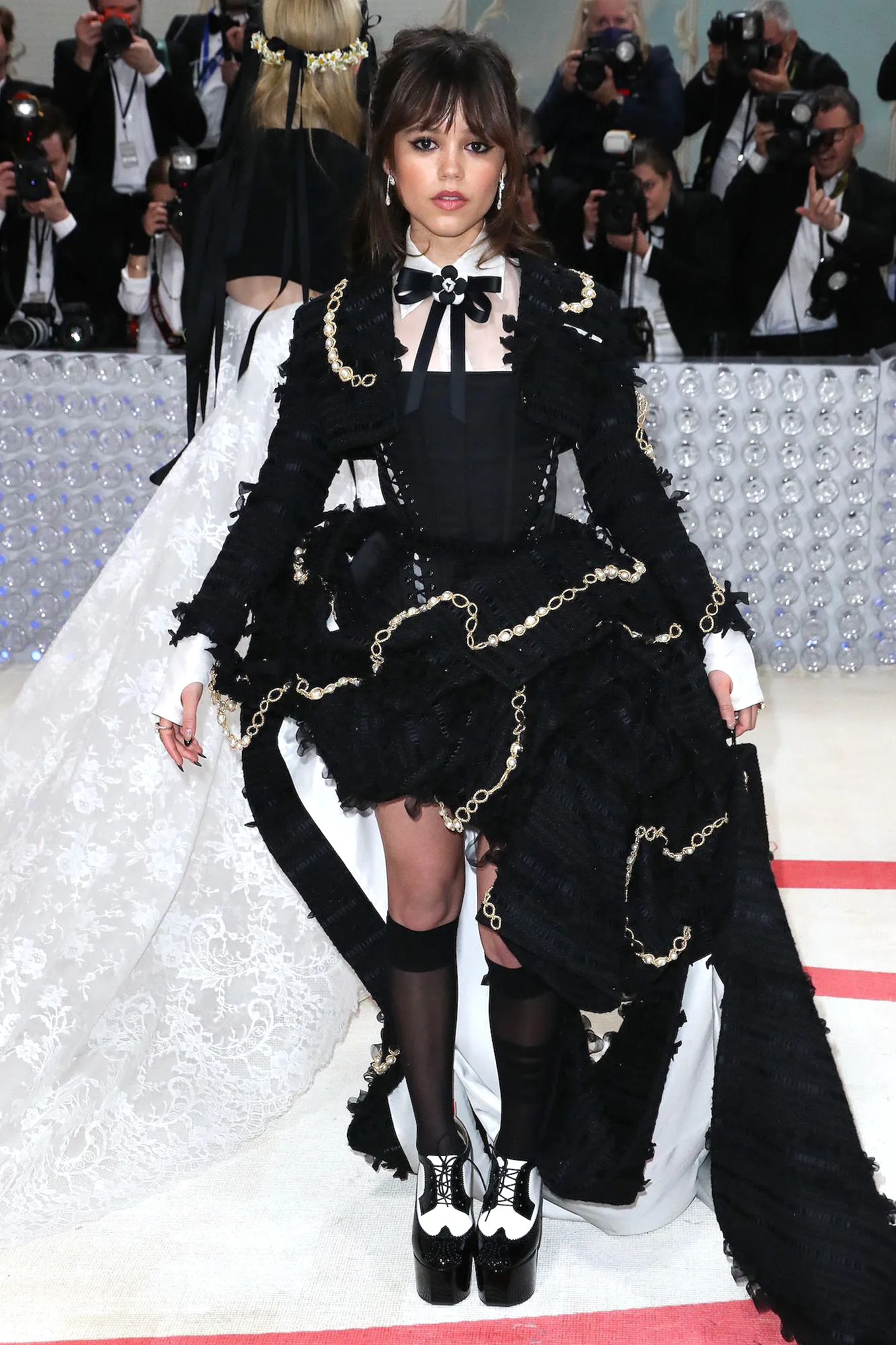 Ortega brought her grunge glam vibes to the Met Gala last month, gracing the steps of the Metropolitan Museum of Art in a Victorian-inspired ensemble by Thom Browne. The edgy look included a corset bodice and a ruffled skirt that was adorned with pearls. The Scream V actress teamed the garment with knee-high stockings and black-and-white patent heeled brogues.