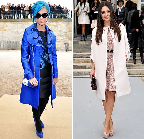 She’s the latest face of Christian Dior, so of course Mila Kunis, 28, attended the French fashion house’s show on Saturday. She chose a pale pink lace dress, black patent leather belt, white cashmere coat and nudes peep-toe heels, all by Dior.