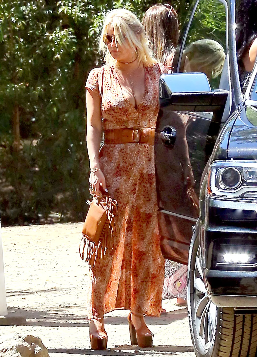 Simpson, 35, paired the low-cut maxi dress, crafted from semi-sheer material with a floral print, with a choker necklace, wide belt, and fringed Valentino purse. The mom to Maxwell, 3, and Ace, 2, also added impressively tall platform sandals, though she made strolling in them (and on rocky ground!) look like a cinch.
