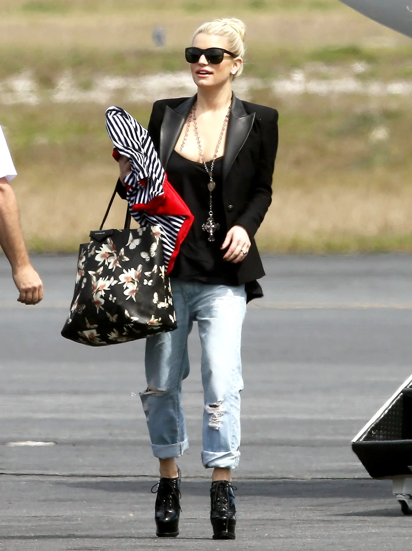 Simpson, 34, accessorized the edgy outfit with sky-high platform oxford heels, dark sunglasses, and a long, layered necklace. The fashion mogul wore her platinum blonde locks up in a high bun with minimal makeup as she prepared to board the flight with her brood.