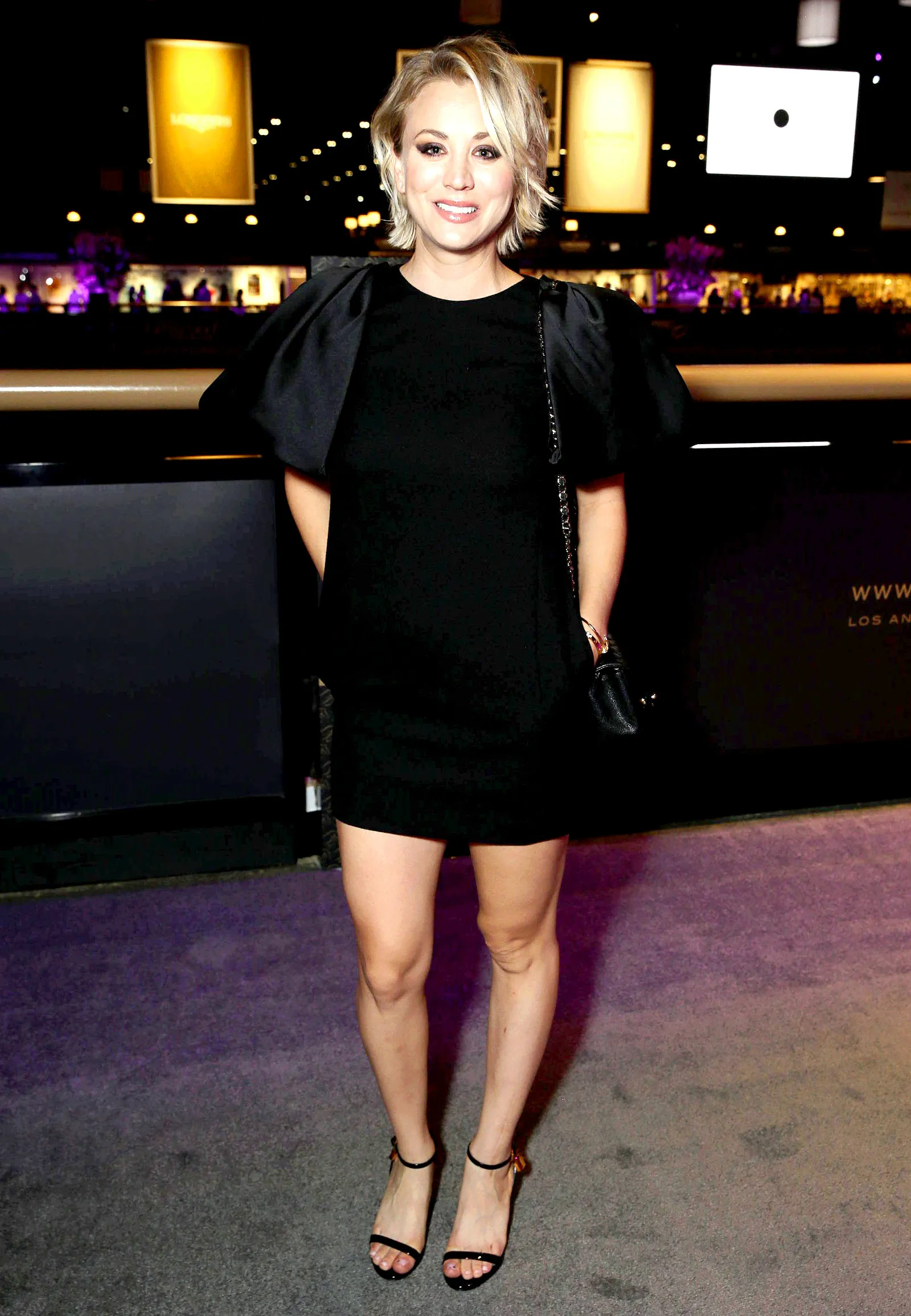 The Big Bang Theory actress, 29, put on a brave face as she posed for cameras in a flattering black sheath dress by Giambattista Valli with dramatic sleeves, paired with a matching shoulder bag and minimalist Tom Ford shoes.