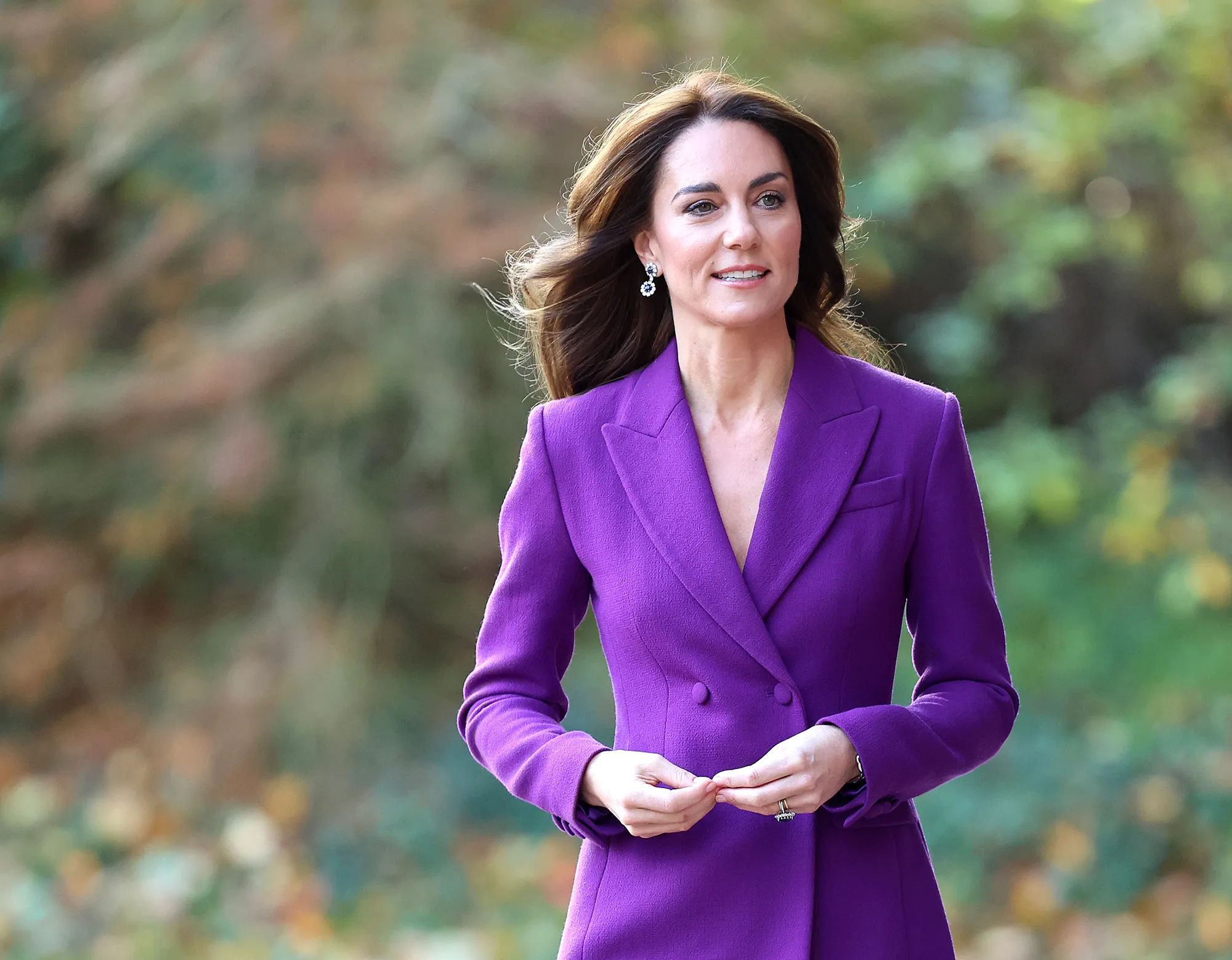 The Princess of Wales delivered a keynote speech at the Shaping Us National Symposium at the Design Museum in London on Wednesday, November 15. She wore a double-breasted blazer and tailored trousers in matching amethyst shades, slipping on blue suede Gianvito Rossi heels to match her sapphire jewelry.