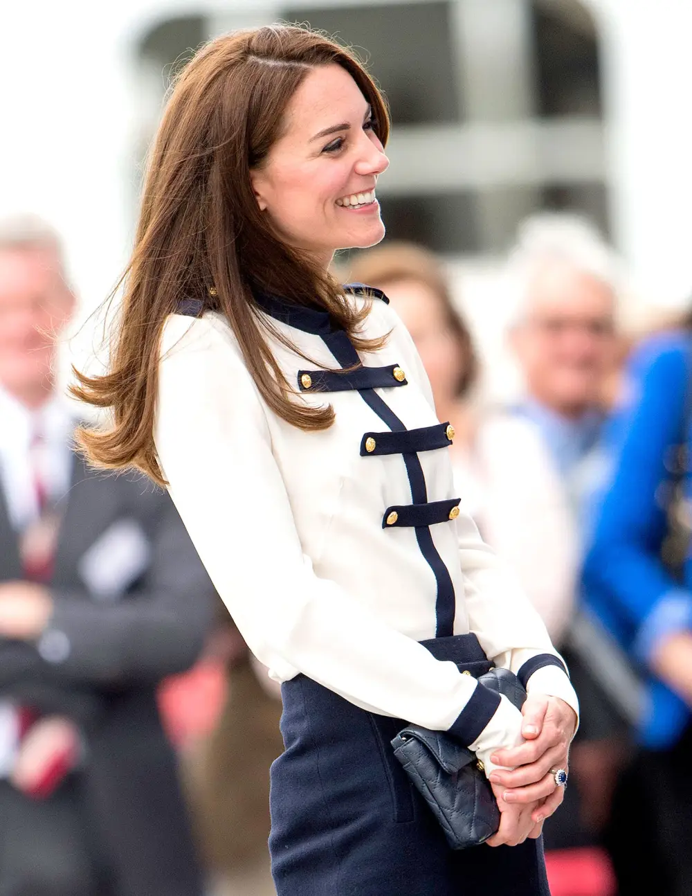 For her busy day, the duchess, 34, who is a patron of the trust, gave some serious sailor uniform vibes. Her Alexander McQueen ensemble included a silk georgette blouse with navy blue piping and shiny gold buttons paired with a matching wool crepe pencil skirt. A pair of navy blue Prada pumps and a clutch completed her look. The duchess debuted this outfit in August 2011 when she and Prince William visited the riot-torn communities of Birmingham. She chose it again in 2014 at the Summerfield Community Centre in Birmingham.