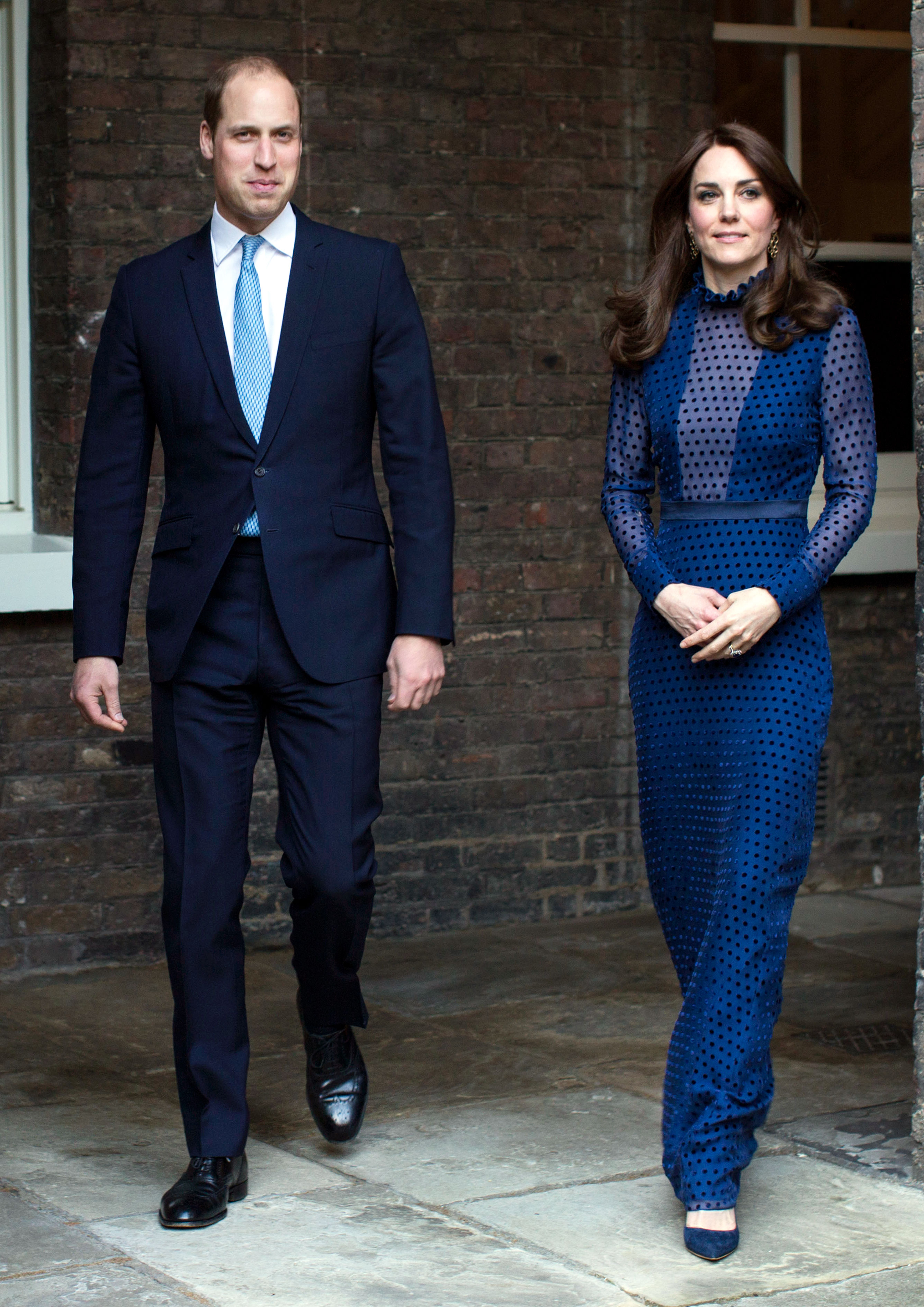 Middleton, who shares son Prince George, 2, and daughter Princess Charlotte, 11 months, with husband Prince William, accessorized the ensemble with gold dangling earrings and blue suede shoes. She also modeled her signature bouncy blowout, with her bangs tucked behind one ear.