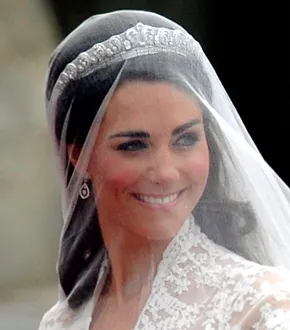 Her tiara, (Cartier), was made in 1936 and was purchased by The Duke of York (King George VI) for his Duchess (The Queen Mother) three weeks before he succeeded his brother as King. Queen Elizabeth received the tiara from her mother on her 18th birthday. The sparkling tiara held Middleton's transparent veil, made of ivory silk tulle with a trim of hand-embroidered flowers.