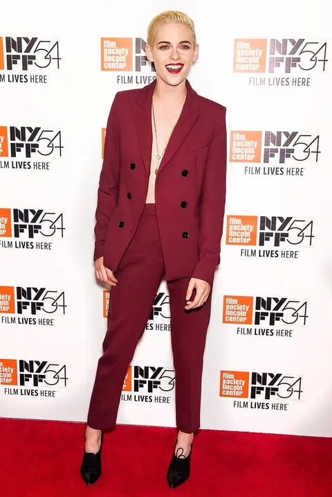 The bold sartorial choice came three days after her appearance at the 2016 New York Film Festival, where Stewart went shirtless in an unbuttoned Sandro suit, offering a flash of her bare chest. She vamped up that style with a matching oxblood statement lip.
