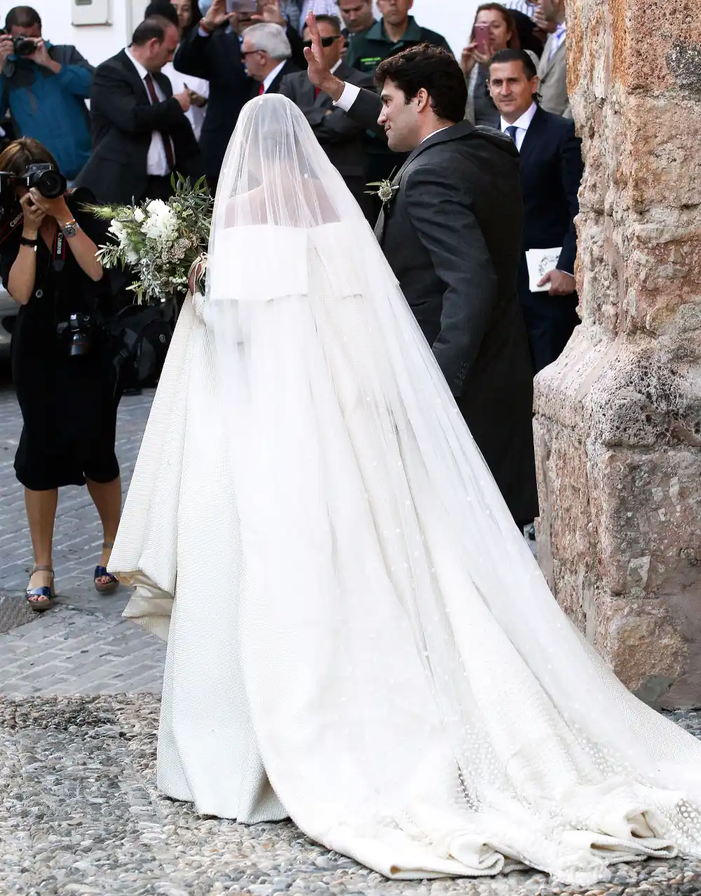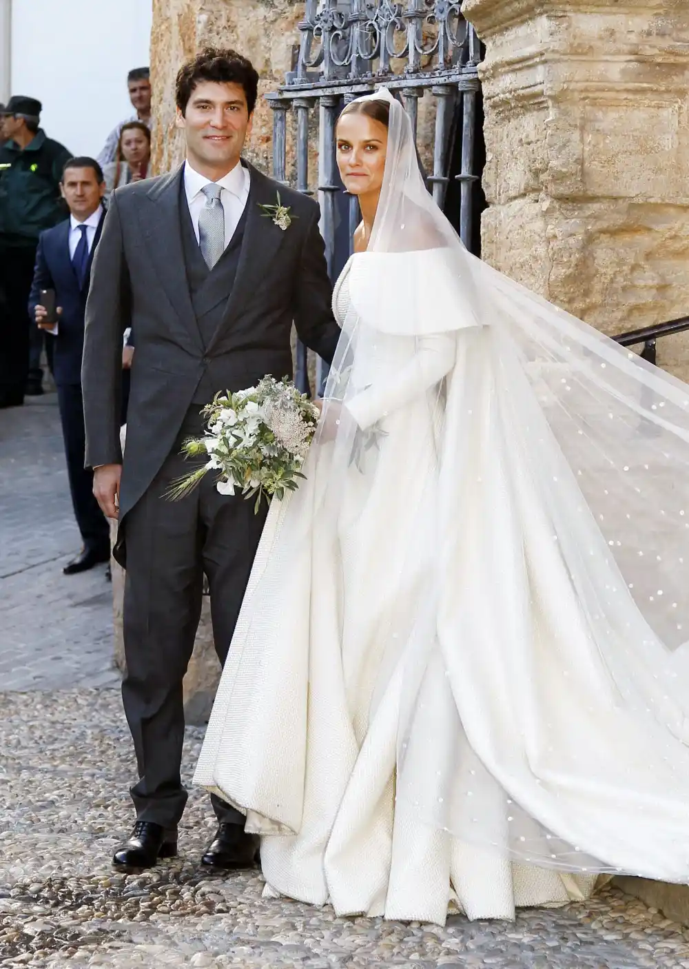 For the celebration, which was also attended by Spain’s former king Juan Carlos I and singer James Blunt (who is married to the bride’s cousin Sofia Wellesley), the bride wore an off-the-shoulder Emilia Wickstead gown with a flowing cathedral veil in a Swiss dot pattern. The dress featured long sleeves and a full skirt.