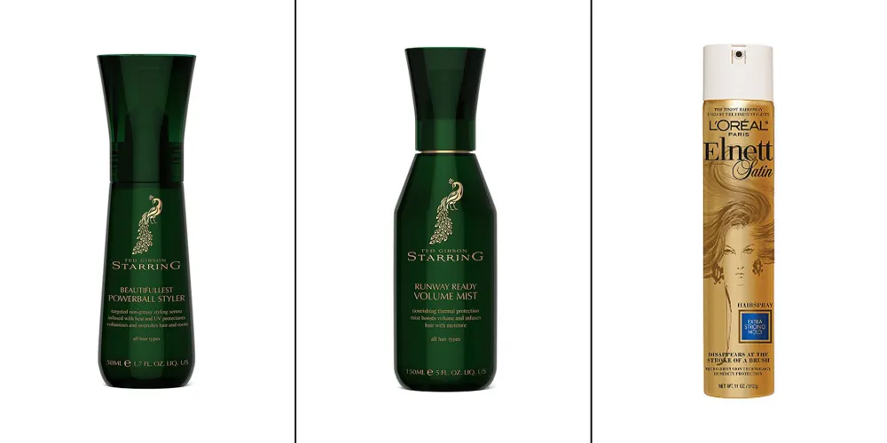 From left: Ted Gibson Starring Runway Ready Volume Mist ($48, tedgibson.com), Ted Gibson Starring Beautifullest Powerball Styler ($62, tedgibson.com), L’Oréal Elnett Satin Extra Strong Hold Hairspray ($14.99, lorealparisusa.com)