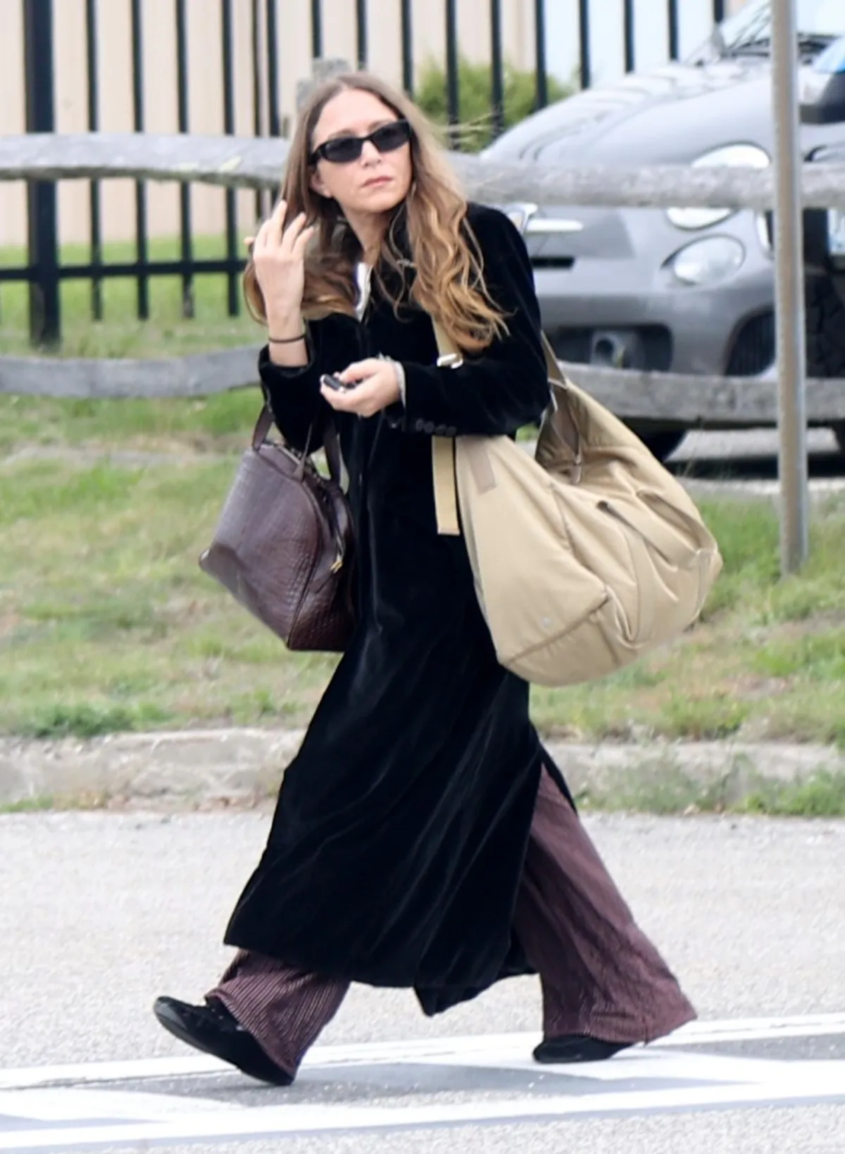 Olsen, 38, was spotted walking in the New York suburb on Tuesday, May 20, in photos obtained by Luxury Handbag Shopping. The actress-turned-designer dressed casually in a long black peacoat over wide-legged mauve trousers. She carried an armful of handbags and wore a pair of sunglasses to cover her eyes.