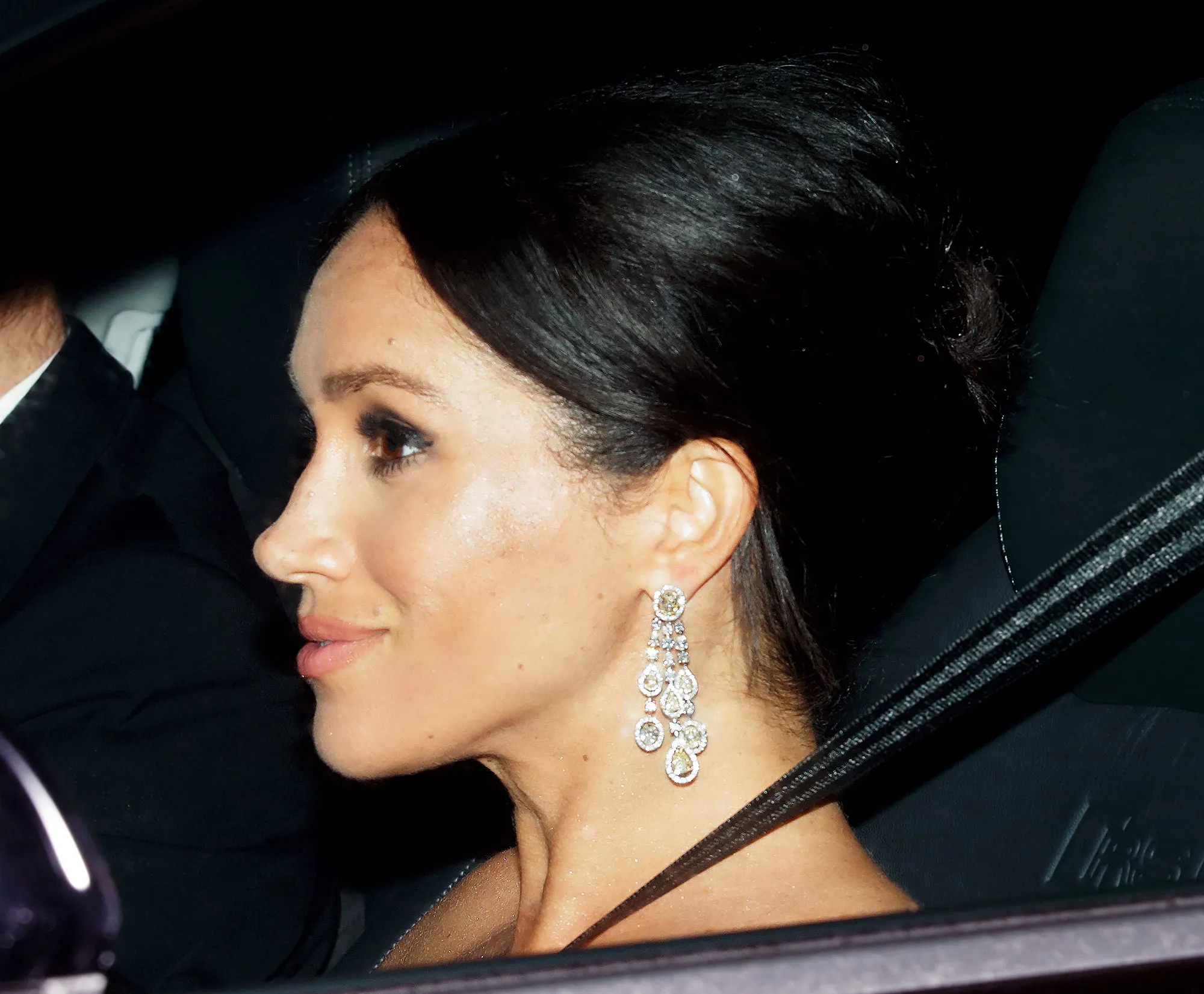 The Duchess of Sussex, who is expecting her first child in the spring with Prince Harry, was spotted leaving Kensington Palace with him and rocking an effortless updo and statement chandelier diamond earrings.