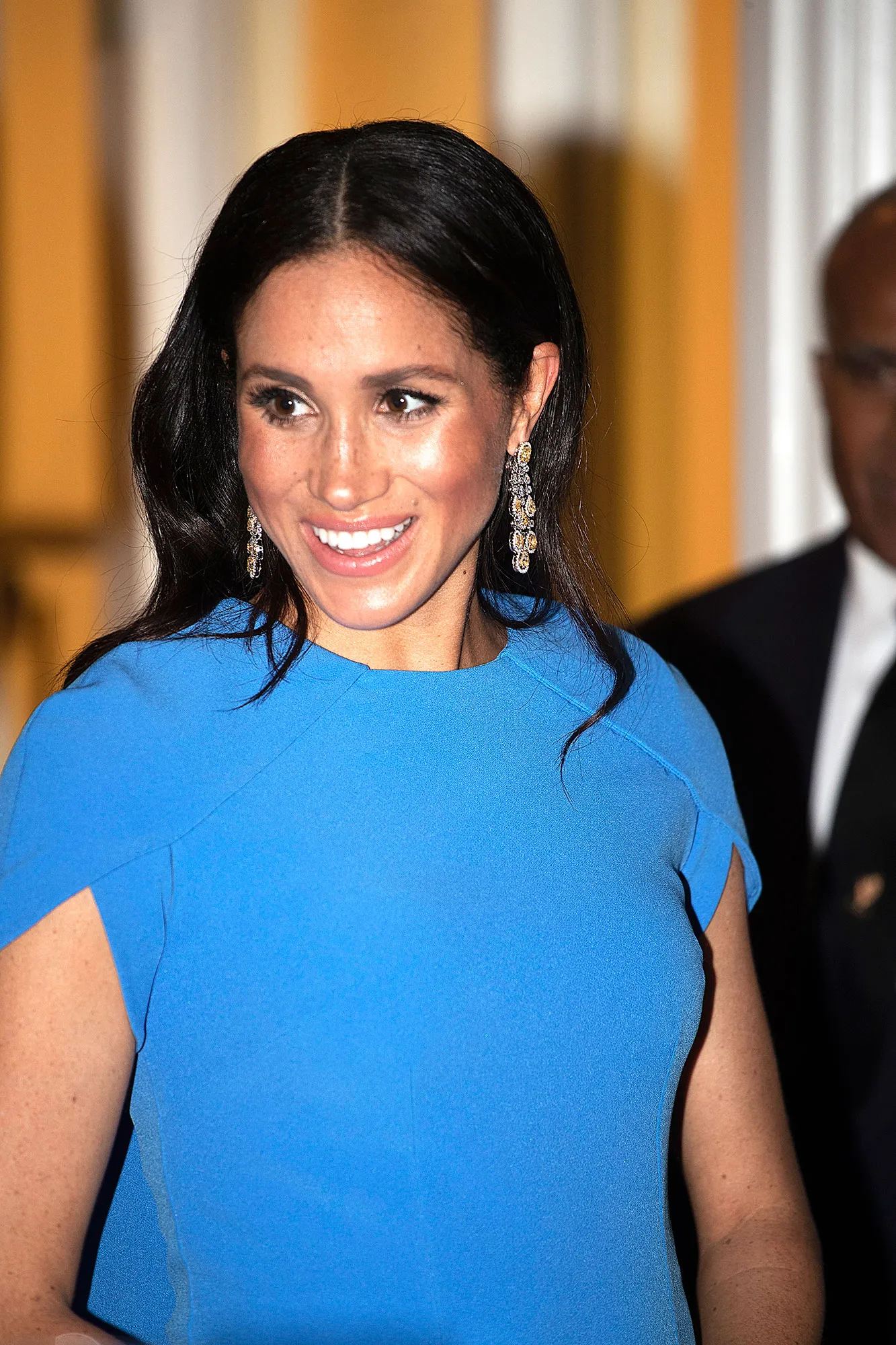 At a banquet with the Fiji president Jioji Konrote, the Duchess of Sussex wore a royal blue dress from Safiyaa that cost almost $1,400. As for the pair of chandelier yellow diamond earrings, Kensington Palace simply said they were “borrowed.”
