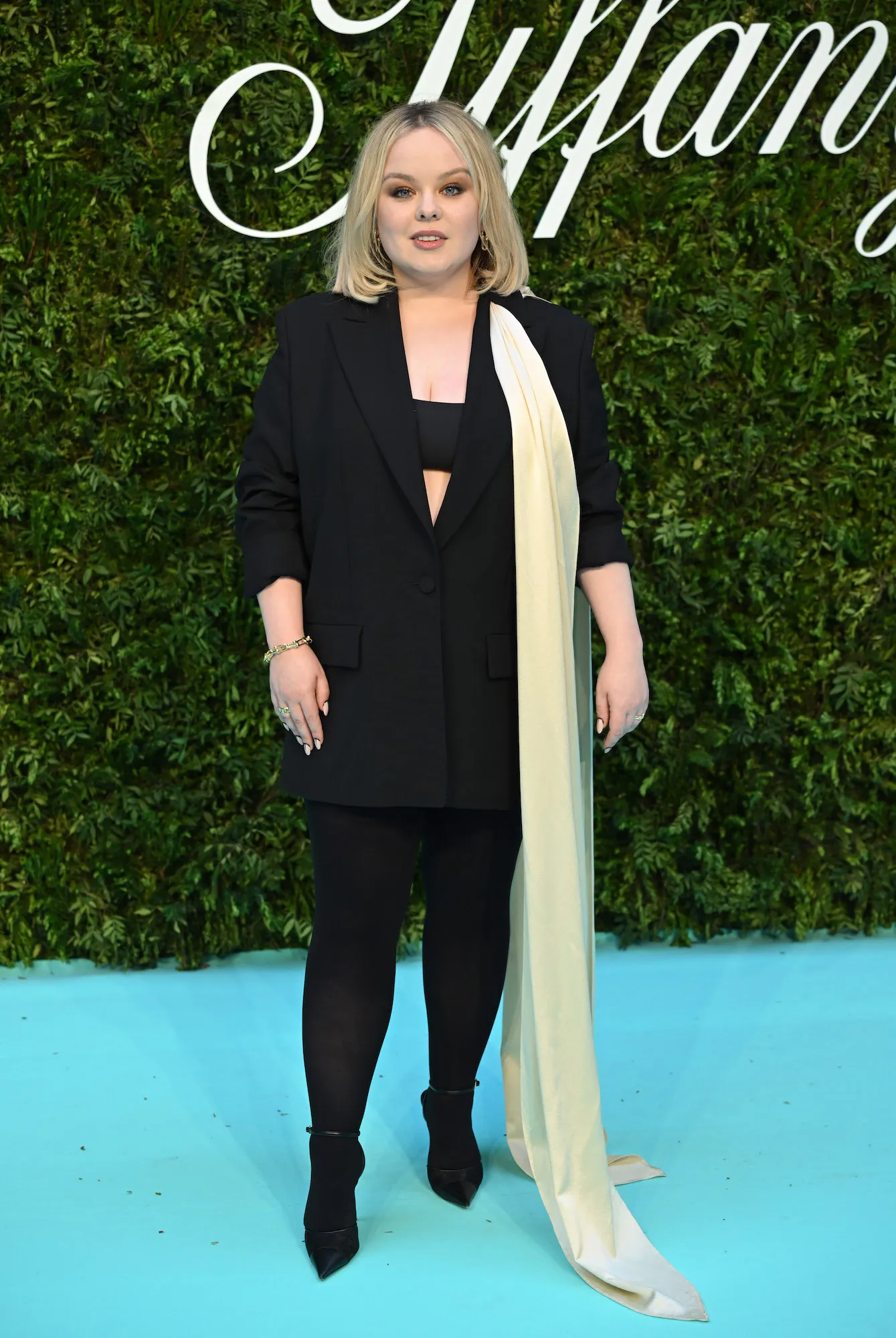 Coughlan’s bra top came from a recent photoshoot she did with her Bridgerton costar Luke Newton. In the images, she rocked a silky crop top featuring a low cut neckline and spaghetti straps from Ganni. The actress paired it with a matching black maxi skirt and a shiny blazer finished with gold buttons. She accessorized with statement gold earrings.