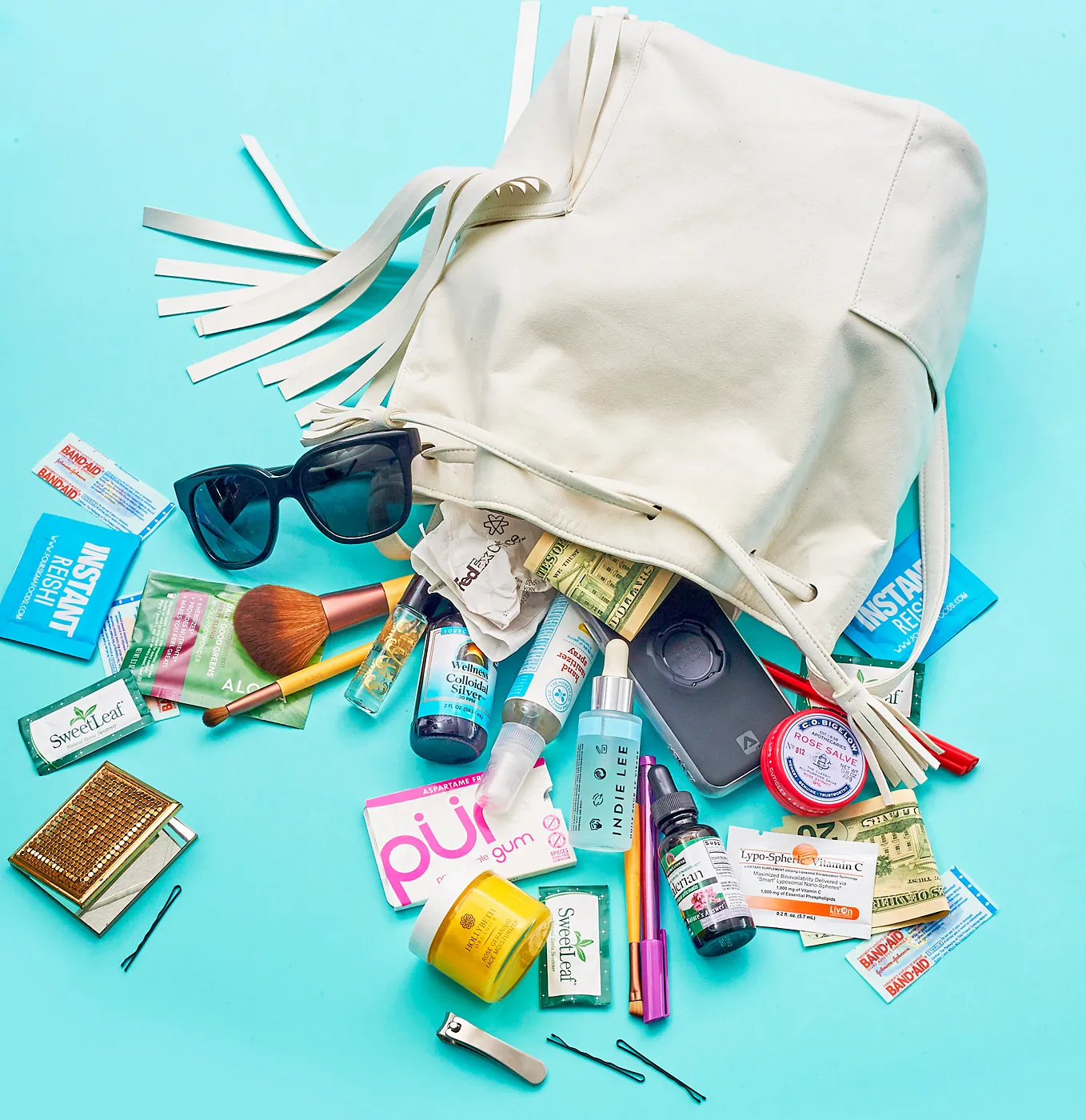 More of what’s in Reed’s bag: sunglasses, cash, nail clippers, hand sanitizer spray, Band-Aids, PUR pomegranate gum, and bobby pins.
