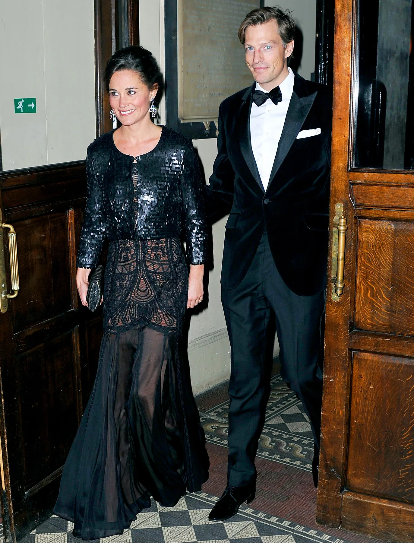 Kate Middleton's younger sister, 30 — perhaps the most famous bridesmaid ever — wore her hair swept up with giant silver earrings and a sequin-covered black coat over top.