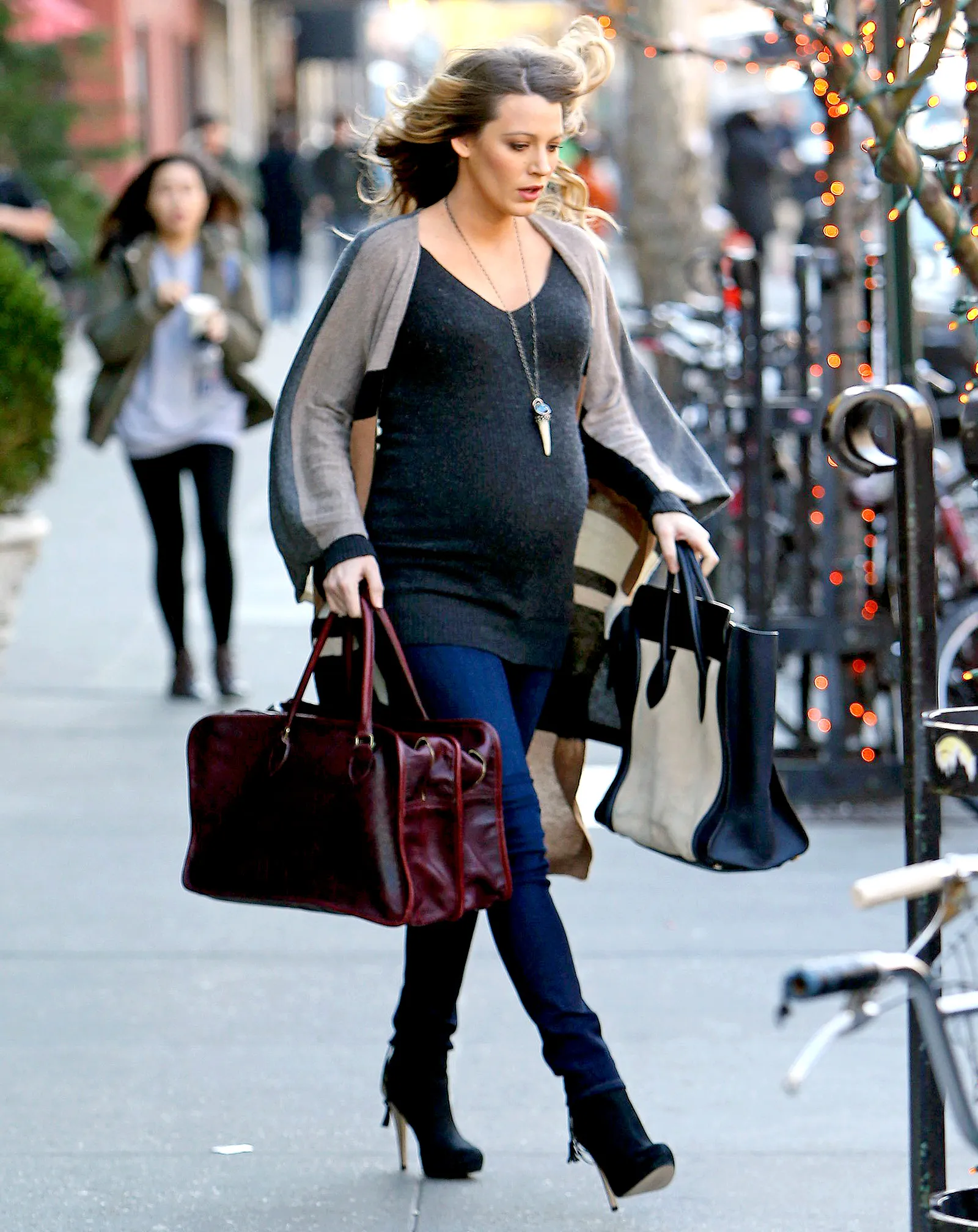 The busy mommy-to-be, who was trotting around with her husband Ryan Reynolds, also carried a boxy maroon leather handbag and balanced out the look with a chic pair of suede black booties.