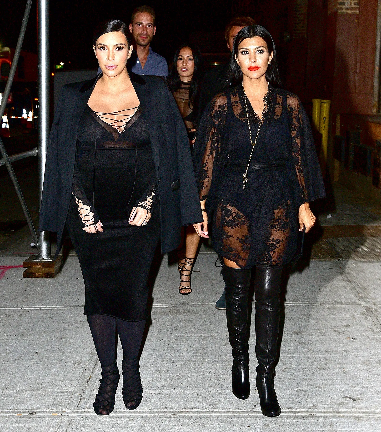 Perhaps taking a cue from Kim, Kourtney also dared to bare that night. The mom of three, 36, donned a black bodysuit, topped by a lace jacket, which she cinched at the waist with a leather belt. Over-the-knee boots and a statement, rosary-inspired necklace added even more heat to her sizzling evening attire.