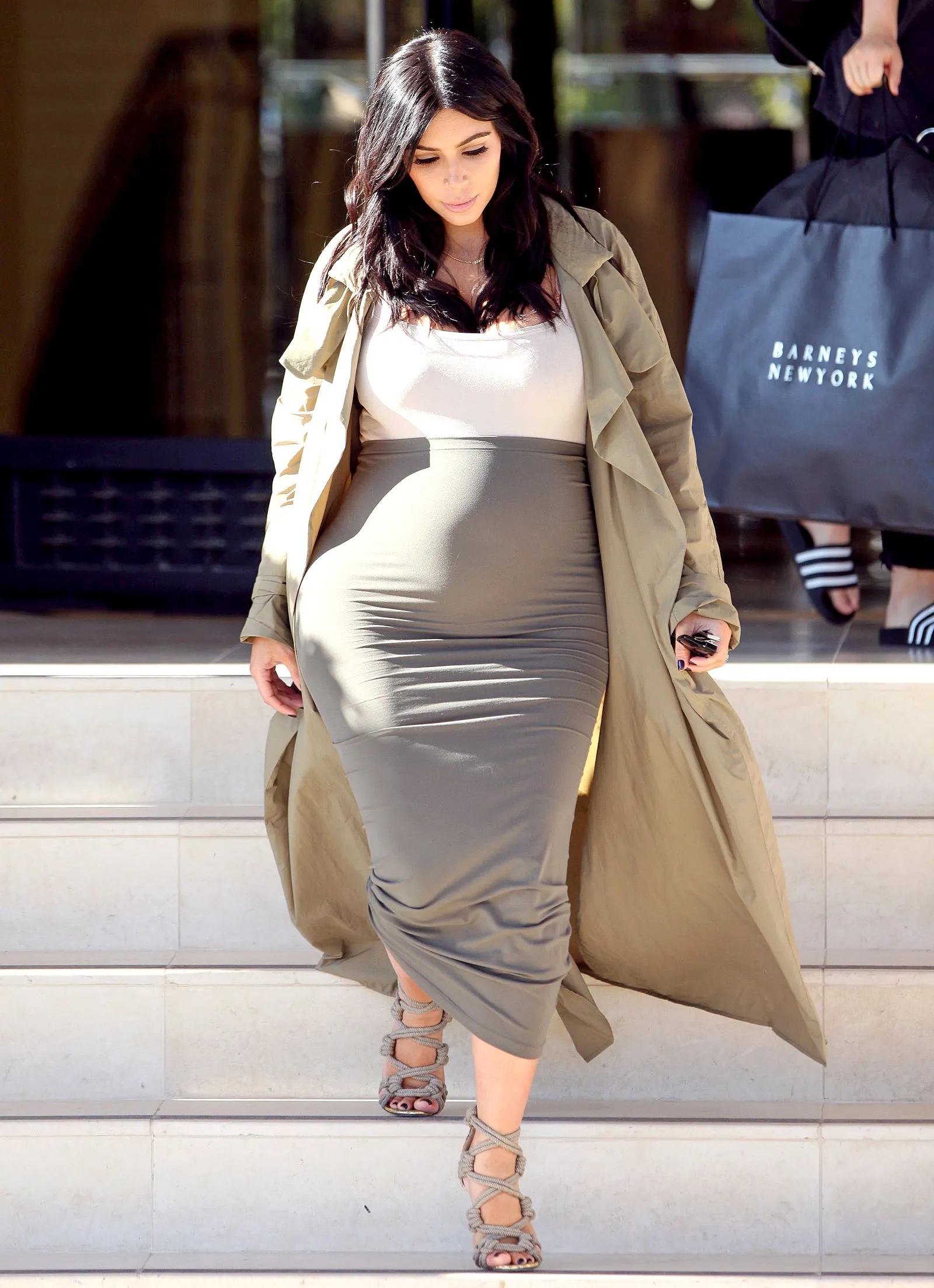 The Keeping Up With the Kardashians star, 34, paired the white top and Wolford “Fatal” Dress (worn as a skirt) with her favorite sky-high Jimmy Choo “Kalmar” braided rope sandals and her go-to pregnancy accent: a long, duster coat, this time in the form of an olive green trench.
