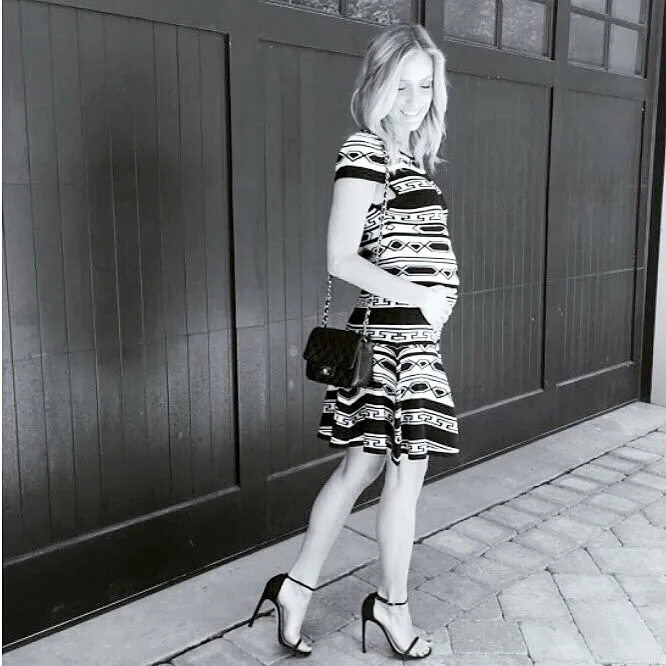 In the snap captioned, "Dressed up the bump today," the mom of two, 28, who is pregnant with a baby girl, stepped out in black Stuart Weitzman heels, a Chanel crossbody bag, and the "Darby Short Sleeve Knit Dress" by Alice and Olivia. The fitted knee-length number clung to her growing baby bump and highlighted her toned legs.