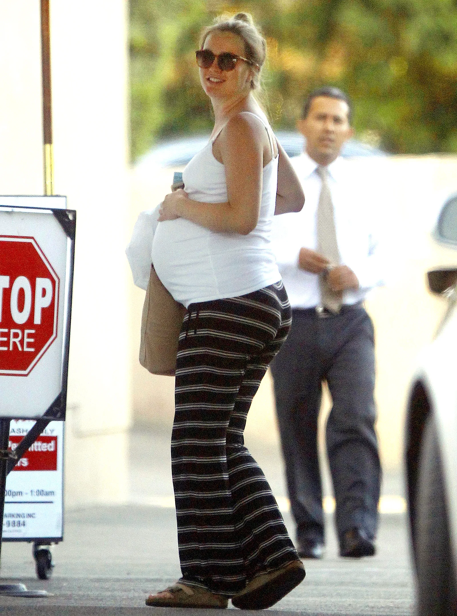 The actress, 29, smiled while wearing a white spaghetti-strap top, stretched over her belly, which she teamed with striped pants, Birkenstock sandals, tortoise shades, and a taupe tote.