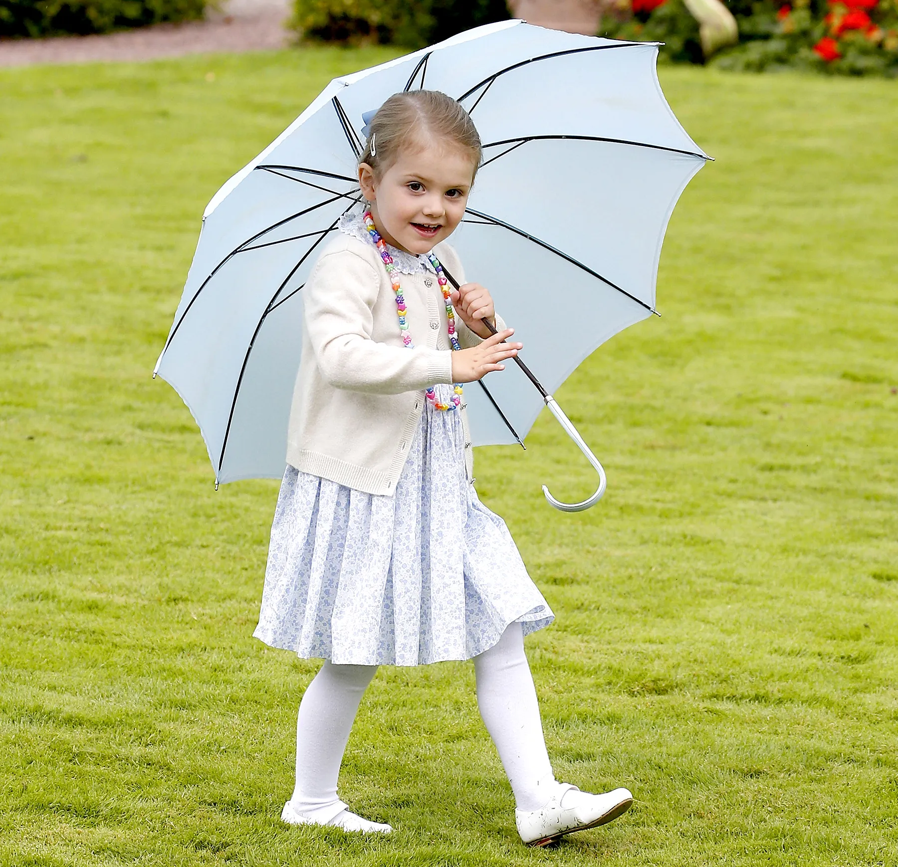 The blonde tot, whose full title is Princess Estelle, Duchess of Östergötland, twirled around with a white umbrella at the celebratory affair, posing for sweet photos. She dressed up in a floral dress with a Peter Pan collar, paired with an off-white plush cardigan, white tights, and white sandals.