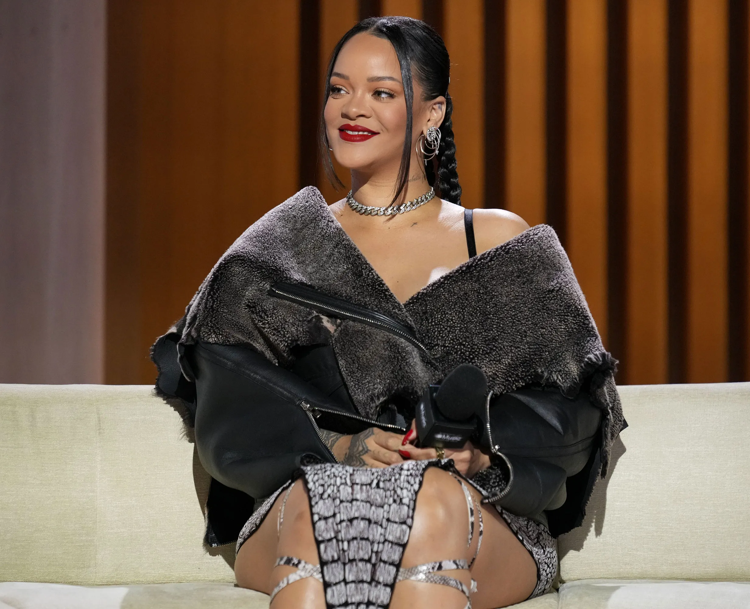 For the event, Rihanna stunned in an Alaïa leather jacket. The garb was worn off her shoulders and featured a fur lining. The “Disturbia” musician paired it with a snakeskin skirt including thigh-high slits at the sides. She finished the look off with a matching pair of pumps with extravagant straps that tied up her legs.