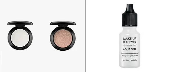 MAC Cosmetics Eye Shadow in White Frost, $16, maccosmetics.com; MAC Cosmetics Eye Shadow in Honesty, $16, maccosmetics.com; Make Up For Ever Aqua Seal, $21, makeupforever.com