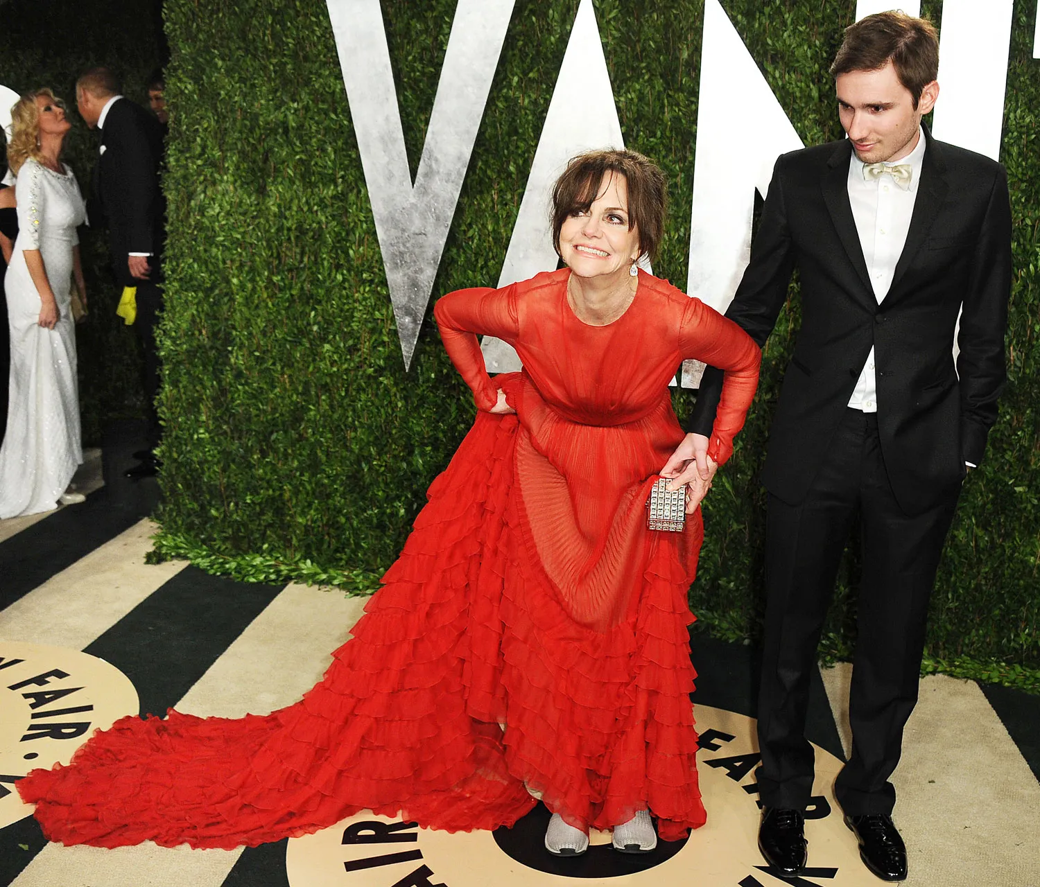 The stunning 66-year-old hit the Academy Awards in a dramatic red Valentino gown with a long, tiered train. On her feet were open-toed stilletos that gave the petite actress height — and possibly aching toes. By the time Field arrived at the Vanity Fair after-party, she had kicked off her heels and slipped into far less fancy, infinitely more comfortable footwear: beige sneakers!