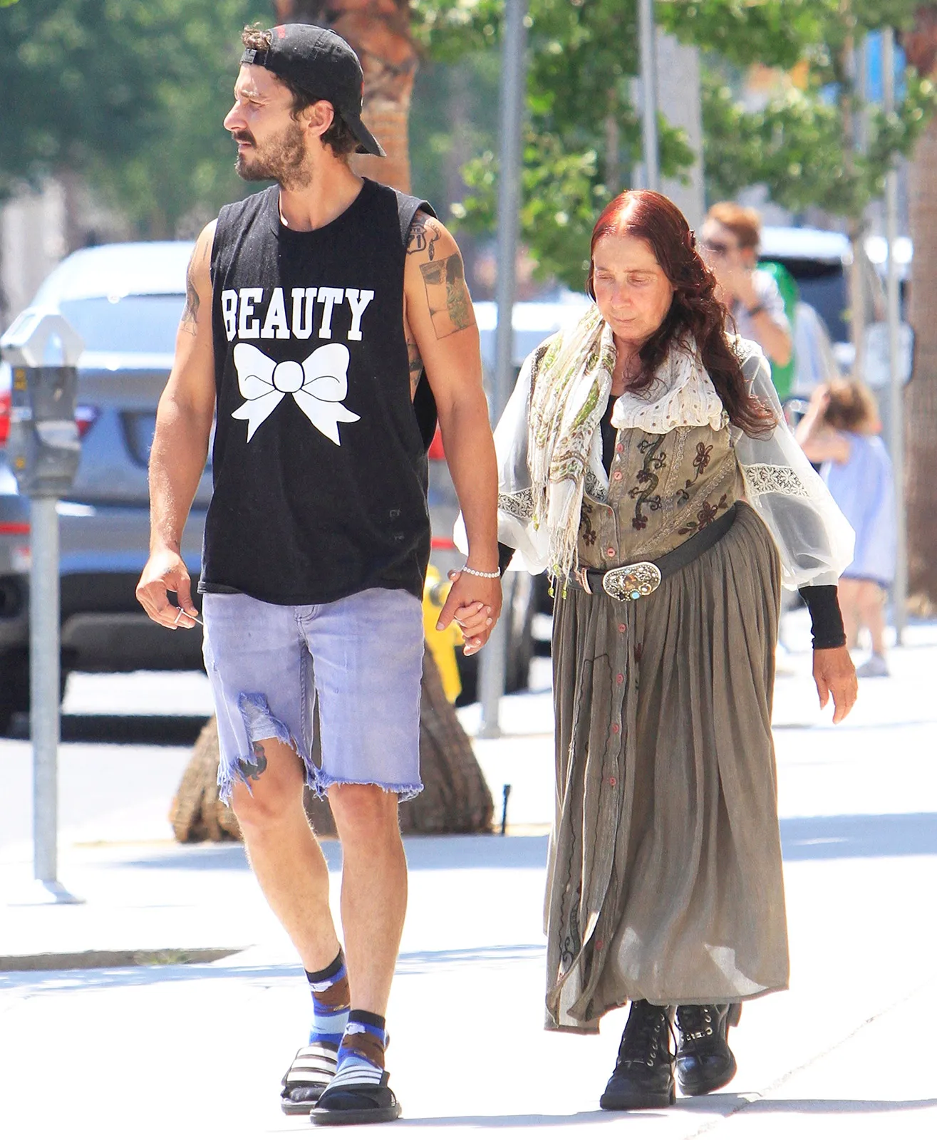 Nothing wrong with loving our mamas and favorite shirt, right? Shia LaBeouf was spotted sweetly strolling hand in hand in Los Angeles with his mom, Shayna Saide, after lunch on Sunday, July 5, as the pair walked to the car. Nothing special about that — except for their outfits.