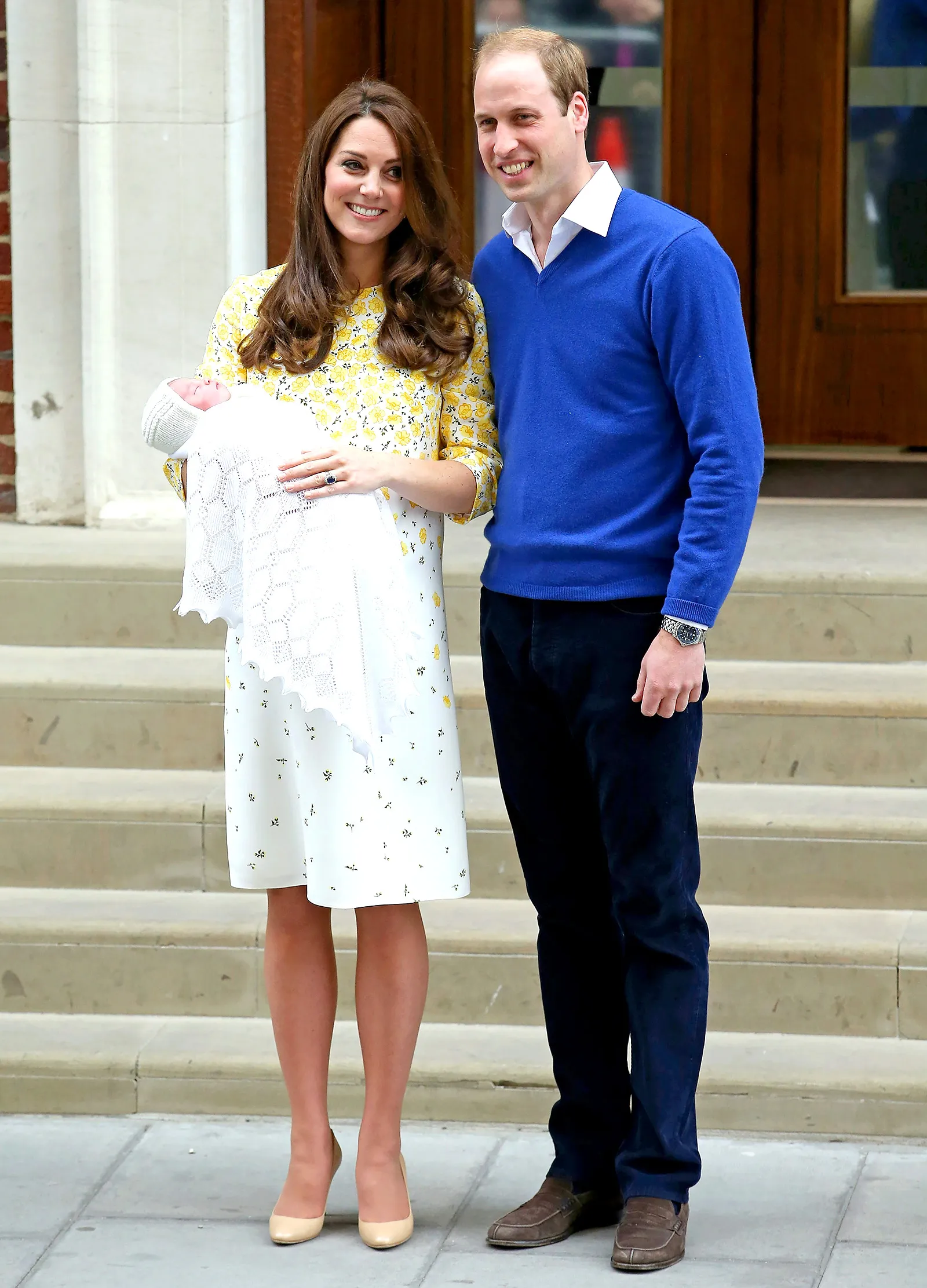 Middleton, 33, cradled her baby girl while wearing a bespoke, buttercup-printed Jenny Packham silk shift dress. (She chose the same designer, one of her all-time favorites, when she presented Prince George in July 2013.) Pearl earrings and nude patent pumps completed the outfit.
