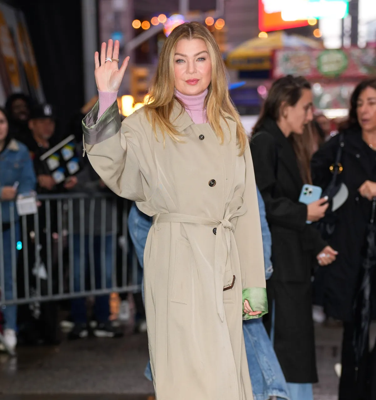 The Grey’s Anatomy star was spotted in New York City, sporting an outfit that has Us excited for spring fashion. Pompeo wore a pastel pink turtleneck sweater, matching wide leg trousers, cream pumps and the closet staple we simply must have: a classic trench coat.