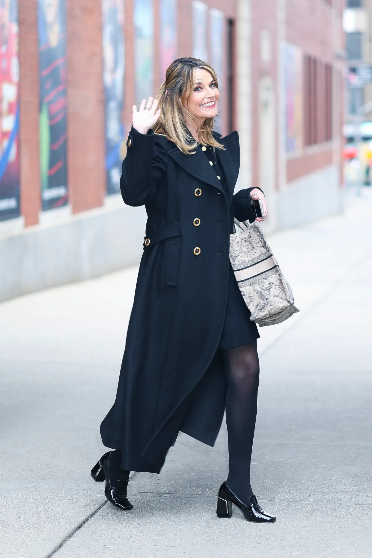 On March 6, the Today Show host was spotted leaving The Drew Barrymore Show, where she palled it up with her famous friend. Sporting her signature polished style, Guthrie walked the streets of New York City wearing a black coat with gold buttons, which she styled with a coordinating midi dress, heeled loafers and tights. However, we were quickly distracted by her large, printed bag — it appears the on-air personality enjoys a dash of Dior!