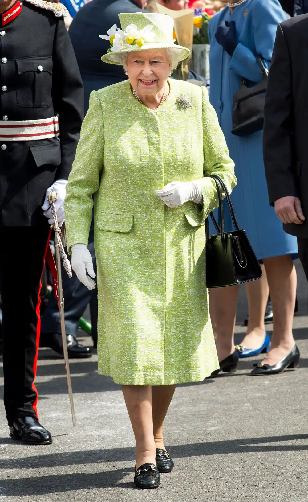 She paired the vibrant “spring grass green” garment with a matching dress and hat that featured a flower accessory (all by her designer and milliner Angela Kelly), black pumps and an elegant Launer London handbag. A pair of Genevieve Lawson white gloves and her favorite pin — the star diamond brooch, gifted to her in 1981 — topped off the entire look perfectly.