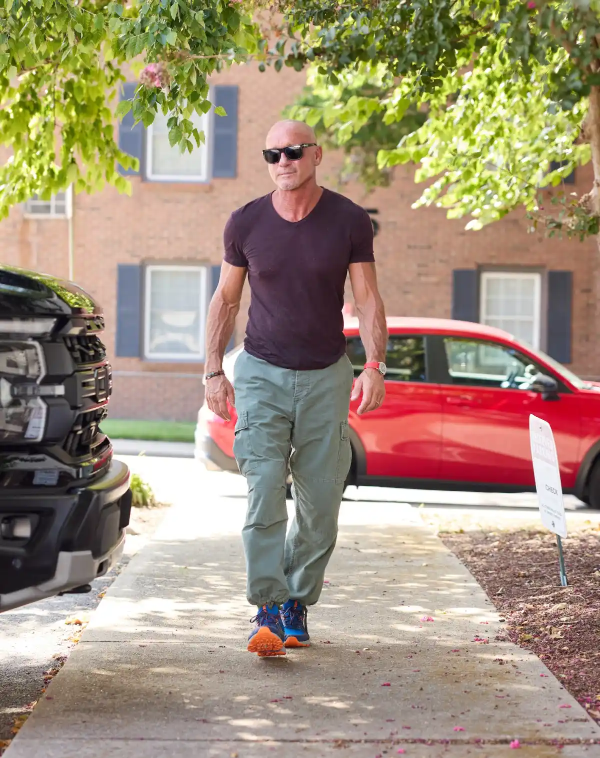 The Grammy winner donned a fitted tee, green cargo pants, blue and orange sneakers with sunglasses while walking the streets of Music City. His chiseled arms — with visible veins and muscles — were hard to miss as McGraw gave a little smirk toward the camera.