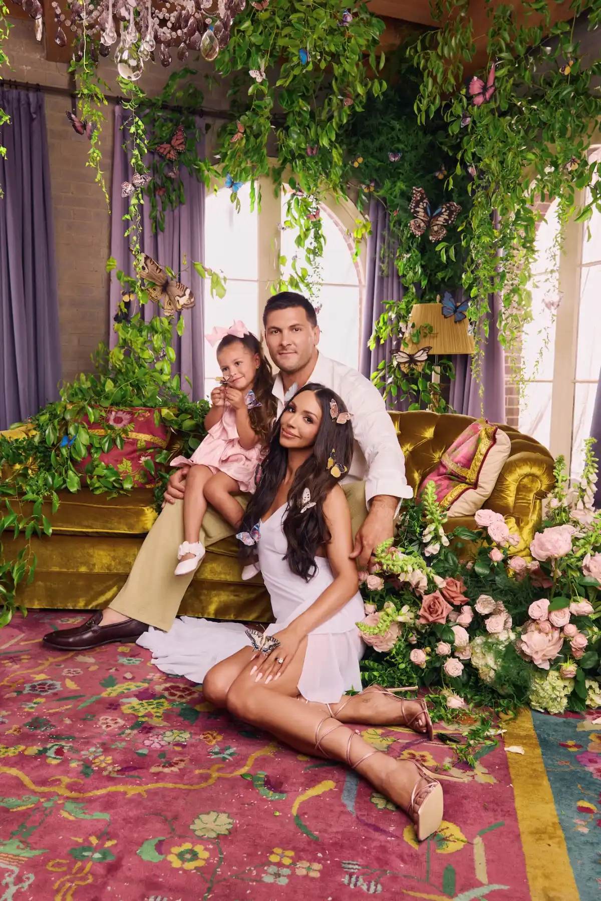Shay also posed with her family in the photo shoot. In one pic, Shay snuggled up with her husband, Brock Davies and her 4-year-old daughter, Summer. Shay looked ethereal in a pastel pink dress with a semi-sheer skirt and thigh-high slit. She accessorized with lace-up heels and butterfly clips in her hair.