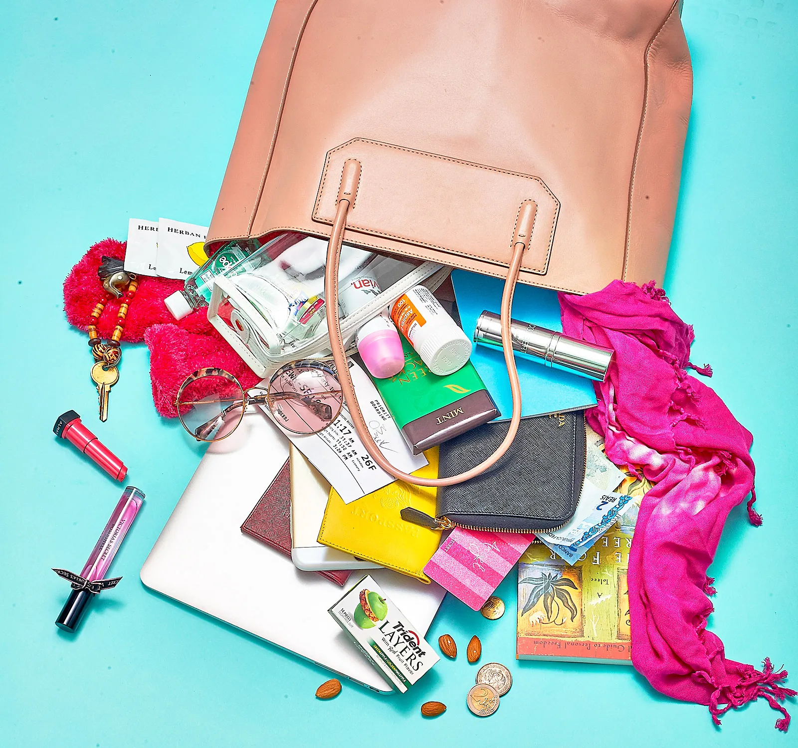 More of what’s in Swanepoel’s bag: black Prada wallet, Victoria Secret Angel card, African beaded keychain, MacBook Air, rose gold Bose earphones, phone charger, iPhone 6 Plus, rose gold Moshi iPhone case, emergency makeup bag, Max Factor Mascara, California Mango cuticle oil, Biotherm moisturizing serum, “The Four Agreements,” Trident gum, almonds, tie-dye scarf, socks, aspirin, and mini Scope mouthwash.