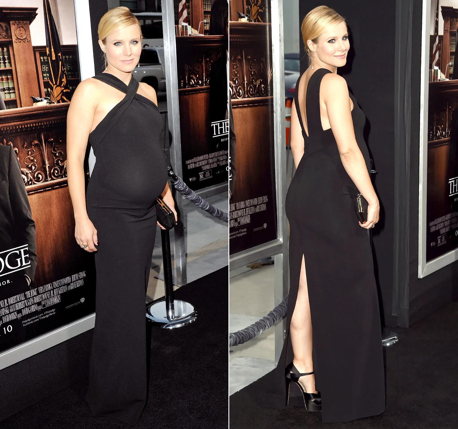 Bell, 34, stepped out on the arm of her husband Dax Shepard for The Judge premiere in Beverly Hills. The expecting mom sported a black jersey gown featuring a crisscross halter neckline by DSquared2. Bell accessorized the look with Brian Atwood heels, elegant teardrop earrings, and a black box Salvatore Ferragamo clutch. A sleek side bun and soft makeup completed the Frozen star’s red carpet style.